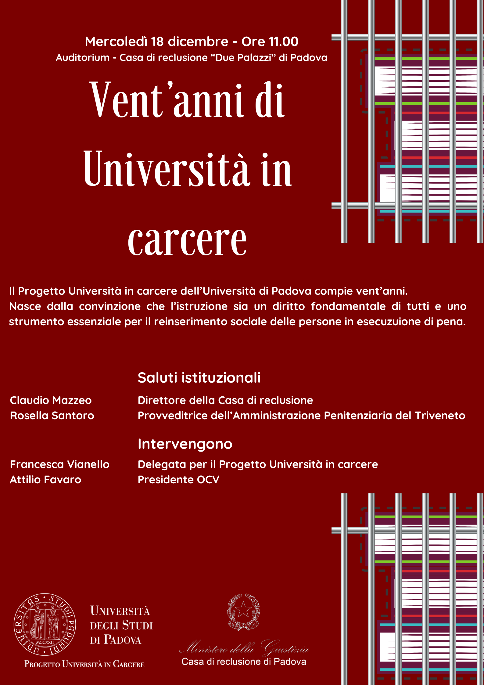 Si tiene mercoledì 18 dicembre alle 11 nell’Auditorium – Casa di Reclusione “Due Palazzi” di Padova, in collaborazione con la direzione della casa di reclusione e con l’associazione Operatori Carcerari Volontari (OCV, un evento che celebra i vent'anni del Polo Universitario in carcere.